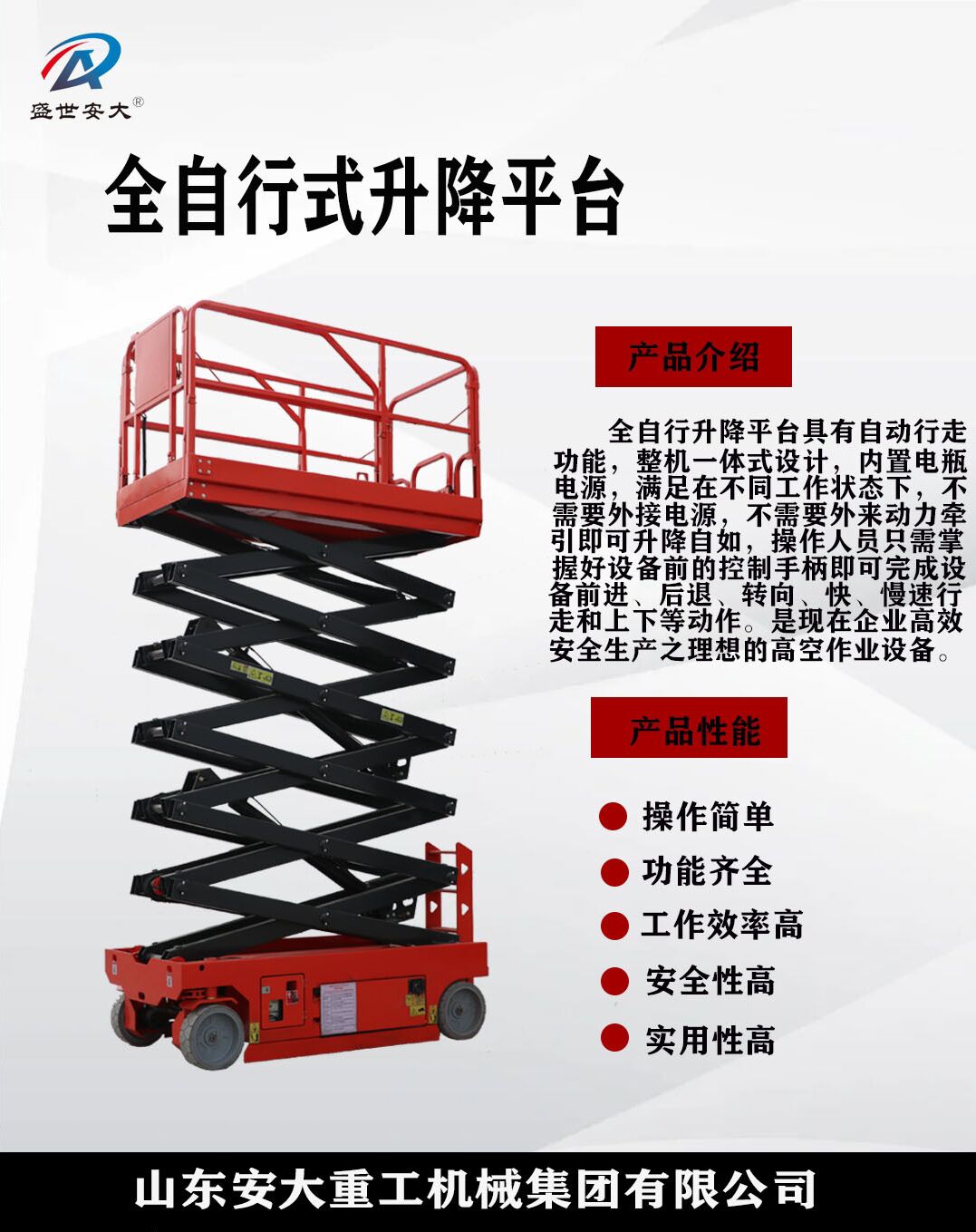 山東安大重工機(jī)械集團(tuán)有限公司是一家集研發(fā)、生產(chǎn)、銷售液壓升降平臺(tái)的廠家。生產(chǎn)設(shè)備先進(jìn),技術(shù)力量雄厚,外形美觀,設(shè)計(jì)新穎、結(jié)構(gòu)合理、升降平穩(wěn)、操作簡(jiǎn)單、維修方便等優(yōu)點(diǎn)。