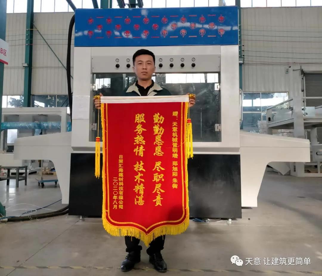 日照匯海建材科技有限公司在感謝信中表示,天意機(jī)械的售后團(tuán)隊(duì)在到廠后服從公司管理,緊盯安裝進(jìn)度,吃苦耐勞、技術(shù)精湛、服務(wù)熱情,使得天意機(jī)械售出的保溫裝飾一體化板生產(chǎn)線按照進(jìn)度試產(chǎn)成功,達(dá)到了預(yù)期效果。
