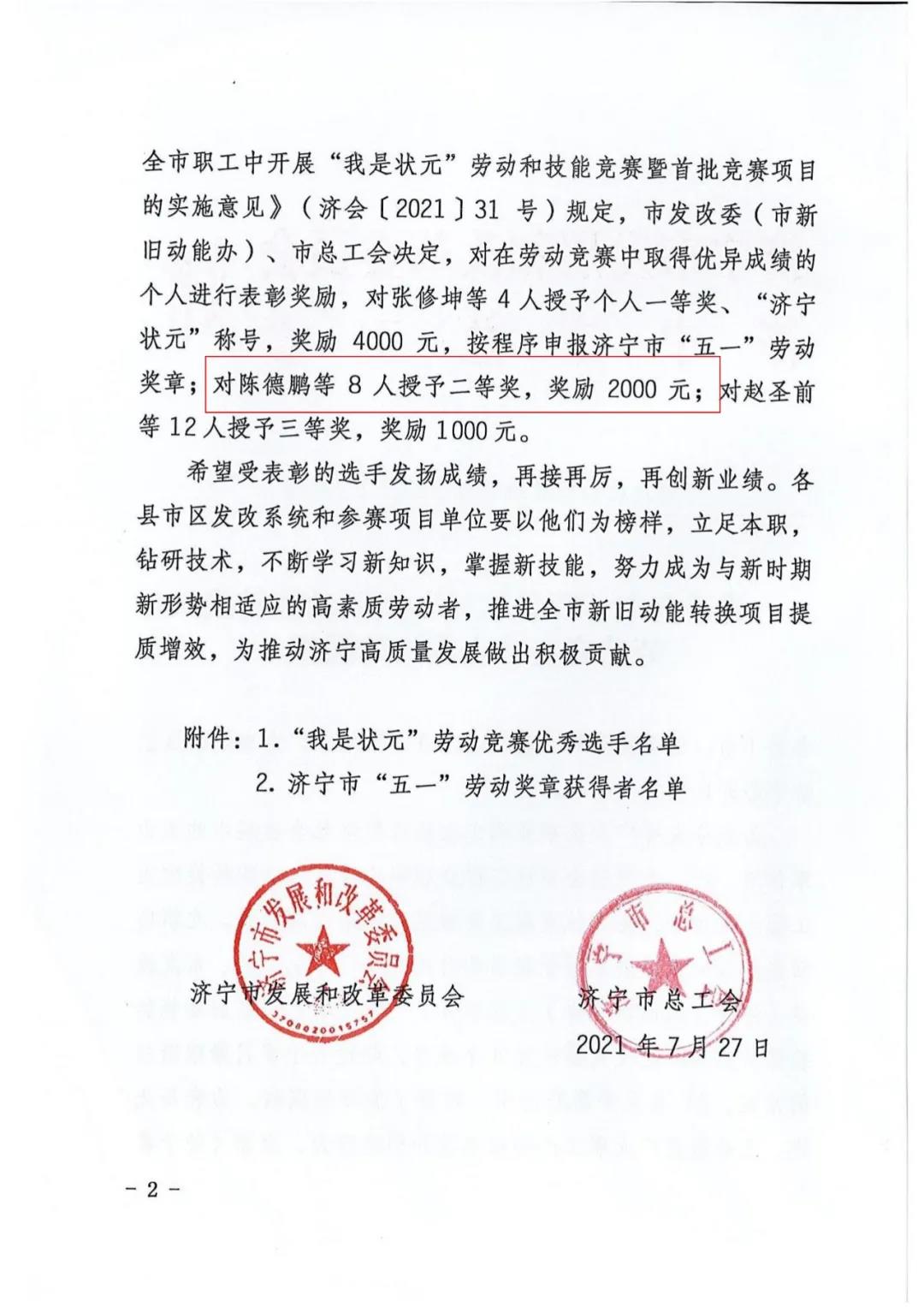 熱烈祝賀我司陳德鵬獲得濟(jì)寧市“我是狀元”勞動(dòng)競賽—新舊動(dòng)能轉(zhuǎn)換重大課題攻關(guān)競賽單元二等獎(jiǎng)