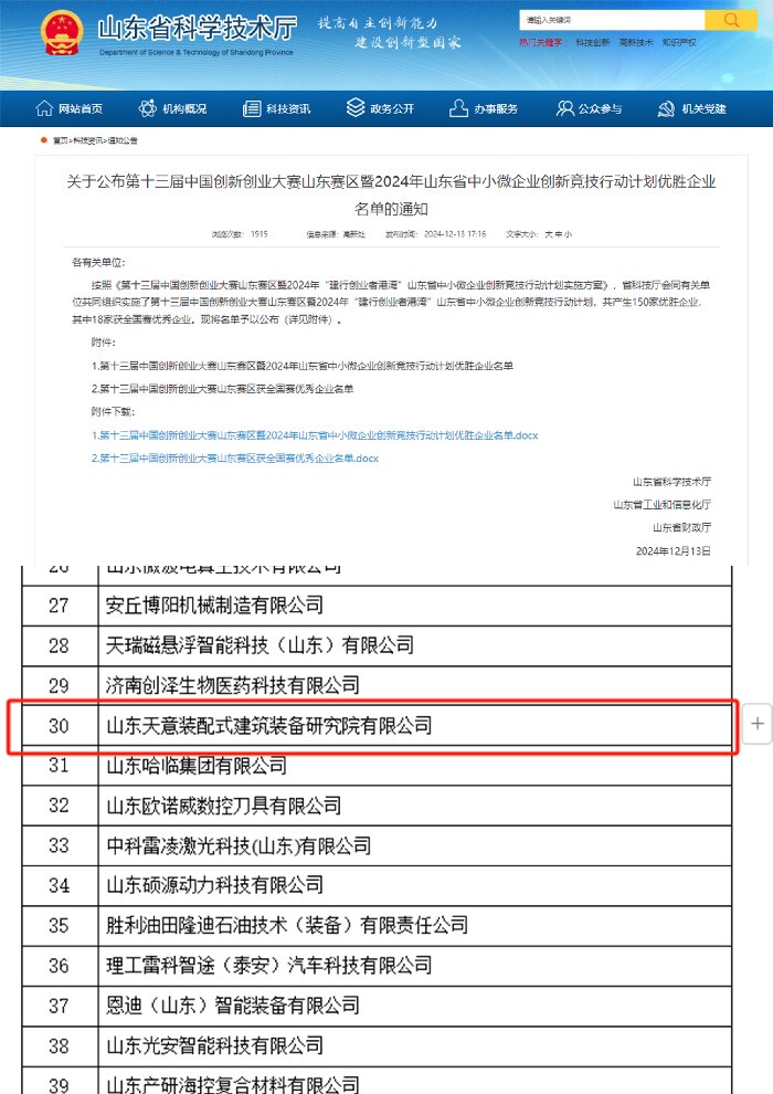日前,山東省科技廳會同有關單位共同組織實施了第十三屆中國創(chuàng)新創(chuàng)業(yè)大賽山東賽區(qū)暨2024年“建行創(chuàng)業(yè)者港灣”山東省中小微企業(yè)創(chuàng)新競技行動計劃,山東天意裝配式建筑裝備研究院有限公司成功入選優(yōu)勝企業(yè)。